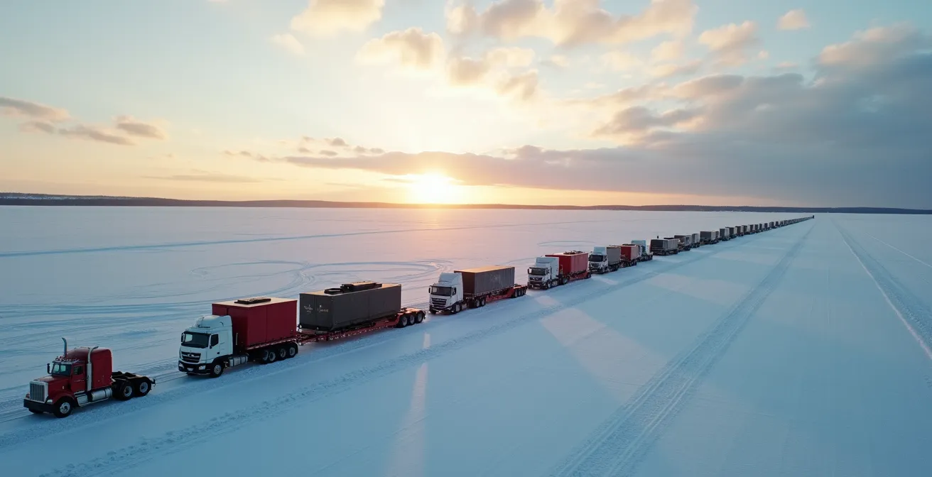 Les routes de glace sont peut-être le symbole le plus spectaculaire de la logistique énergétique canadienne. Ces artères temporaires, construites sur des lacs et des sols gelés, sont des prouesses d’ingénierie qui ouvrent l’accès aux sites de forage et de construction les plus reculés du Grand Nord pendant une courte fenêtre hivernale. Bien plus qu’une simple commodité, elles sont la condition sine qua non de la viabilité de nombreux projets. Sans elles, le transport d’équipements lourds comme les appareils de forage ou les modules d’habitation serait tout simplement impossible.